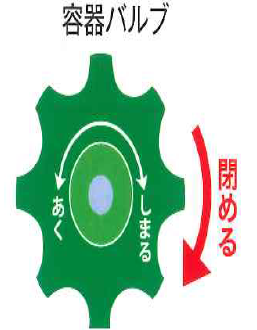 災害の時に容器バブルを閉めることは、二次災害の防止にも役立ちます。容器バブルを閉めるときは、時計と同じ右に回すと閉まります。